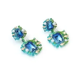 Vibrant blue crystal drop earrings with green accents. Elegant sparkling blue stones framed by green floral-inspired settings. Lightweight design that adds color and shine to any outfit.