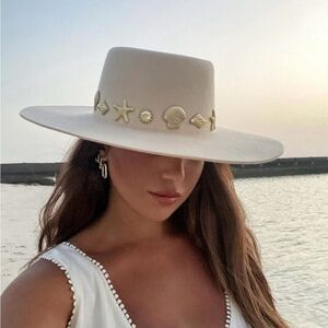 Chic hat in dapper wool features a stiffened silhouette with a dipped crown and goldtone trim capturing seaside imagery of the sun, starfish and conch shells.