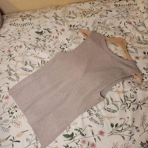 Sleeveless ribbed knit tank with V-neck. Front button detail and subtle pleats. Soft neutral beige color. Versatile layering piece.