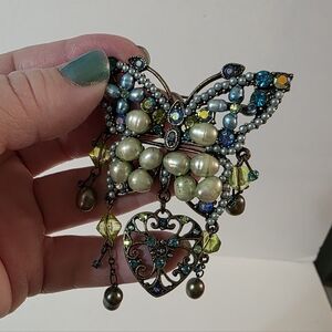 blue green crystal and freshwater pearl butterfly with dangle heart and beads. measures approx 3" x 2.5" great used condition. goldtone metal
