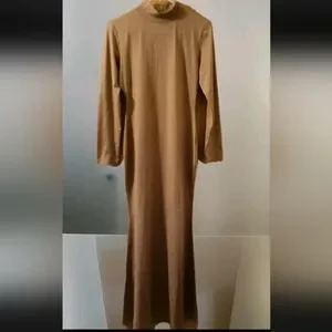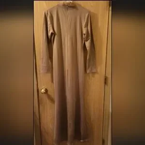 This Women Tan Long Maxi Jersey Dress in solid brown color is a stylish and comfortable option for any wardrobe. With a long sleeve design and zip up closure, it is easy to wear and perfect for a casual day out or a relaxed evening event. The stretchy jersey fabric adds flexibility and the long maxi length makes it a versatile piece that can be dressed up or down. Perfect piece to wear with a long cardigan corset or flashy belt.This dress in size S is a great choice for women looking for a simple yet chic option for their everyday wear.