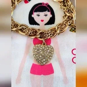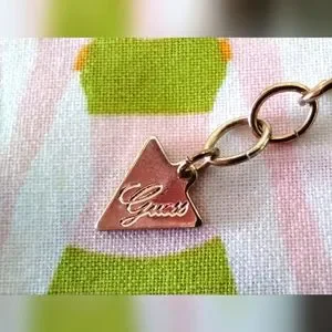 Bows, bling, hearts and pearls, what more can a girl ask for? If romance is in the air, why not flaunt it! This old-school bracelet from Guess is gold-tone and has 2 interwoven chains, 5 charms and a Guess tag at the end of the extension. In great condition with no missing crystals and ready to wear!