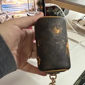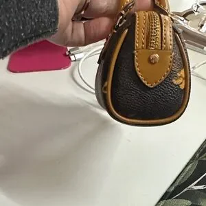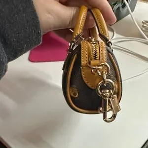 Coach mini satchel keychain in black with mustard floral accents. Pebbled leather with gold-tone hardware. Compact and stylish accessory for keys or bags.