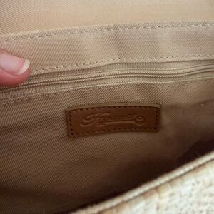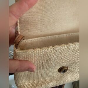 Textured woven Fossil crossbody. Beige body with embroidered leaves and bead accents. Adjustable brown strap for hands-free wear. Secure flap closure. Playful, versatile style for everyday outfits. Great condition a few faint stains