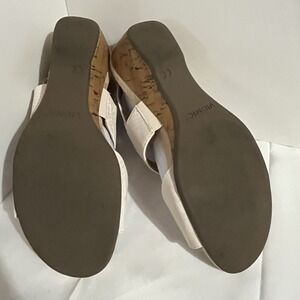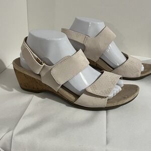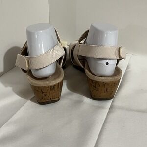The Vionic Snake Print Adjustable Wedges Kanya is a stylish and versatile pair of women's heels perfect for various occasions such as travel, parties, casual outings, work, or business. These adjustable wedge heels feature an open toe design with a loop and eye closure, a mid-heel height, and a comfortable rubber outsole. The beige snake print pattern adds a trendy touch to the neutral beige color, making them a chic choice for summer and spring wear. The man-made textile upper material ensures durability, while the adjustable features provide a personalized fit for a size 9.5 US shoe size or 7.5 UK shoe size. Perfect for adult women looking for a fashionable and comfortable heel option. In excellent condition.