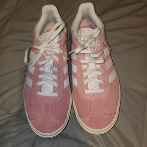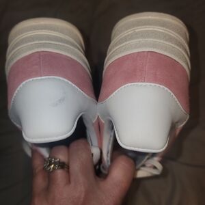 adidas Gazelle platform sneakers in pink suede with white accents. Low-top design with cushioned platform sole for added height and all-day comfort. Classic three-stripe styling and gold Gazelle branding for a stylish finish. Color is not faded that is just the lighting in the picture.