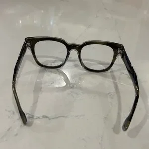 Square acetate frames in grayish green color. Blake Huwahara. Clean, versatile style. Comfortable wide temples. Modern oversized, everyday look. Prescription readers 2.5, slight distance lens. UNISEX.