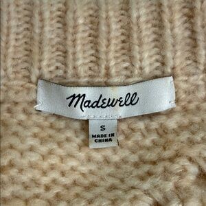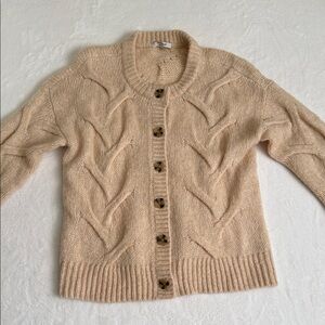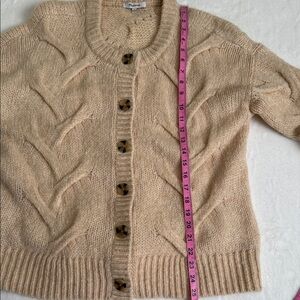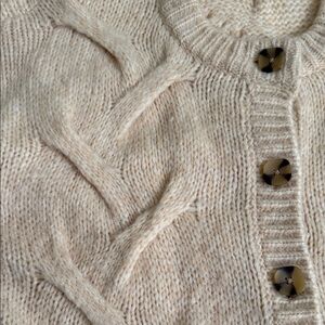 Super cute soft cream cable knit cardigan from Madewell with tortoiseshell buttons. Lightweight yet cozy knit for versatile layering. Crew neckline and ribbed hem provide a polished fit. Easy to pair with jeans or skirts for everyday wear.