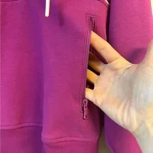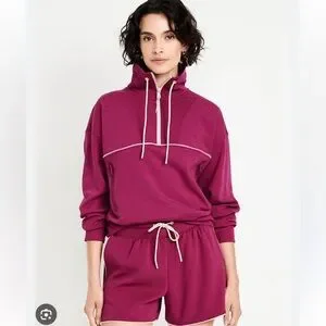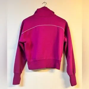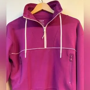 In excellent like new condition; worn once. Soft half-zip pullover hoodie with a high collar. Contrast drawcords and piping detail. Relaxed fit for everyday wear. Lightweight, breathable fabric. Length 21”; PTP 20”. Pet-free, smoke-free home.