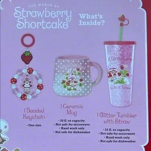 Donβt miss out, if youβre Strawberry π Shortcake π° fans. Up for sales is this Strawberry π Shortcake π° Gifts sets. This bundles set comes with Tumble, Mug & Keychain set, 3 boxes of Strawberry π Shortcake π° facial sheet mask pack (5 pcs each box, 15pcs facial sheet masks total), and a Strawberry π Shortcake π° Spa Glow Set ( comes with 2 pcs 1oz hand cream, 2 lips π masks, 2 eyes masks, and a cosmetics bag)