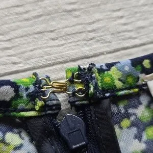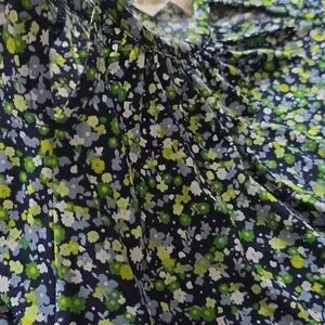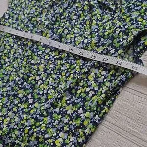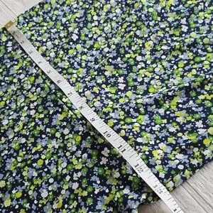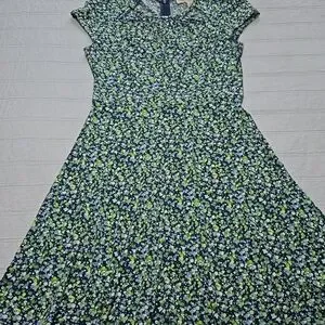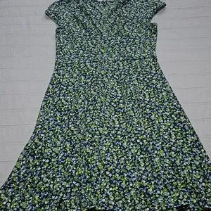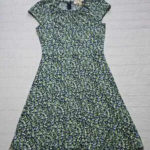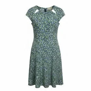 Fit-and-flare silhouette features a vibrant, all-over ditsy floral print in shades of kelly green, lime, and cornflower blue against a classic navy background. The standout feature is the unique triangular keyhole cutouts at the neckline, adding a modern, edgy twist to a timeless feminine shape. It’s perfect for everything from a spring wedding guest look to a polished office outfit or a weekend brunch. Made from a high-quality, comfortable stretch fabric with a hidden back zipper for a seamless fit.