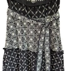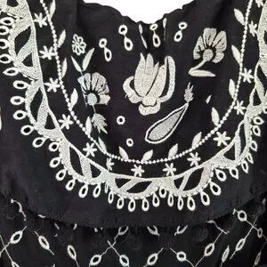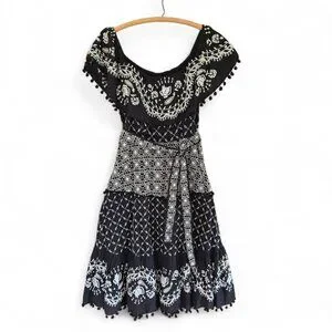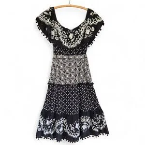 The Anthropologie Marisol dress blends artistry with elegance, featuring an off-the-shoulder design adorned with intricate floral embroidery. This black-and-white midi dress features a removable waist tie and pompoms for added charm. Made of 100% cotton, it's breathable and suitable for warm weather.