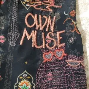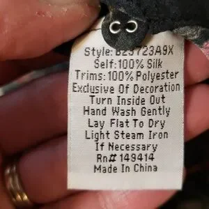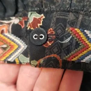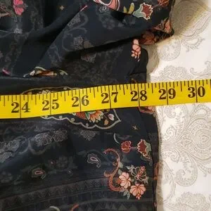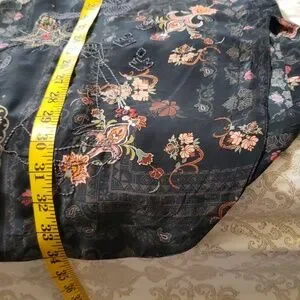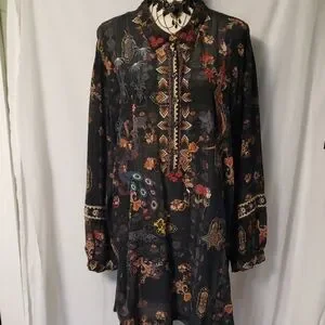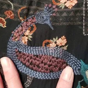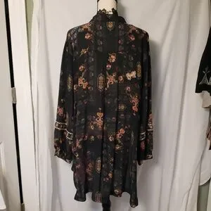 Stunning wearable art work! Black silk with beautifully patterned flowers & amazingly detailed embroidery. collared with 5 buttons on front, balloon sleeves with 3 tiers at mid forearm and button cuffs on sleeves, side slits, too. Hard to do it just with a description. No damage, like new without tags. not sure my mom ever wore it.