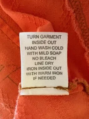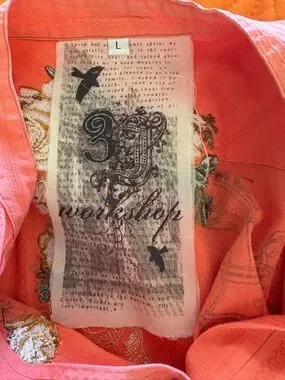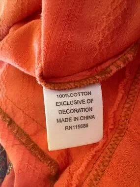 Beautiful tangerine orange colored shirt with floral and bird embroidery. Collarless. Cuffed sleeves. Raw hem. Large.