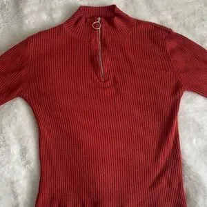 Fitted ribbed knit top. Half-zip front with ring pull.