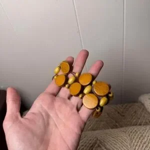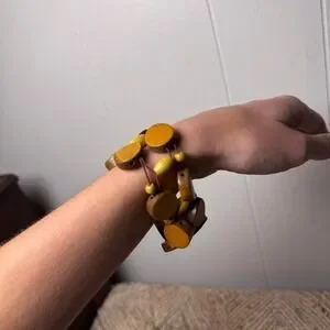 Bohemian-inspired stretch bracelet features a double-row design of polished wooden discs in a warm honey-brown hue. Interspersed with smaller olive-green oval beads and tiny spherical accents, the piece is strung on durable elastic cord for a comfortable, flexible fit. The natural textures and earthy tones make it a versatile accessory for layering or wearing as a standalone statement piece.