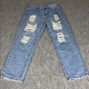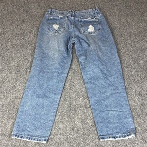 Relaxed boyfriend silhouette in a light blue wash. Distressed knee and thigh detailing for an effortless, lived-in look. Mid-rise with classic five-pocket styling for everyday wear. Pairs easily with tees and casual tops.