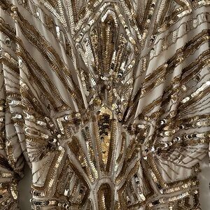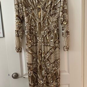 Long sleeve evening dress with dense gold sequins and beadwork. Nude mesh base with ornate geometric embellishments. Sleek, body-skimming silhouette for formal events. Eye-catching shimmer under lights.