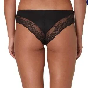 Comfortable black bikini panties with delicate lace trim at the hips. Soft, breathable fabric for everyday wear. Smooth front and sheer lace back detailing for a feminine look. Pack of three offers great value and wardrobe staples.