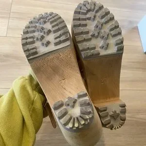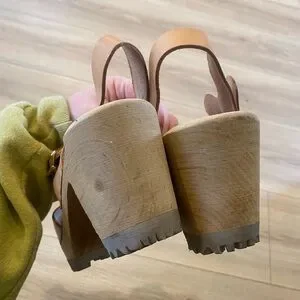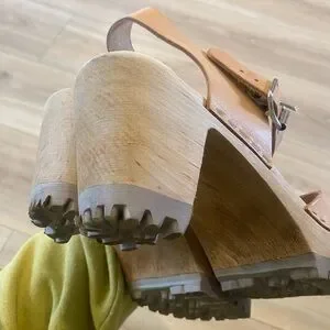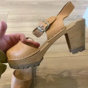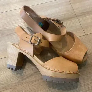Chunky wood-look heel with lug sole. Leather upper with adjustable buckle strap. Open toe clog style for easy wear. Neutral tan shade pairs with many outfits.