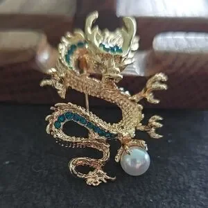 Elegant gold-tone dragon brooch featuring teal crystal accents and a single pearl drop. The gold finish adds a classic shine while the teal crystals provide rich color contrast. A polished pearl accent detail completes the design for refined style.