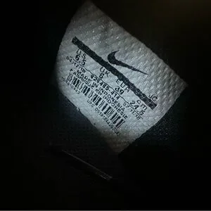 Nike men’s athletic soccer shoes. Black upper with blue heel accents. White Nike swoosh on sides. Lace-up closure for a snug fit. Low-profile turf-friendly sole.