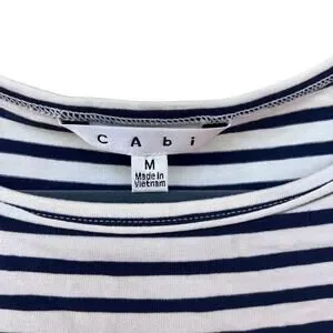 Cabi striped long sleeve top in women’s size medium. Effortless navy and white striped piece with a relaxed fit and sharkbite hem—perfect for a coastal, French-inspired capsule wardrobe.