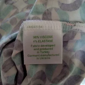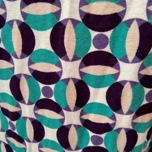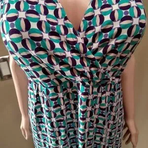 Sleeveless dress featuring a bold geometric circle print. Teal, purple and cream color palette. Soft, drapey fabric with a feminine silhouette. Versatile piece for day or evening wear.
