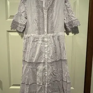 Soft lavender midi dress with eyelet lace panels. Front button-down styling and short sleeves. Defined waist for a feminine shape. Lightweight, airy fabric for warm days.