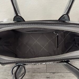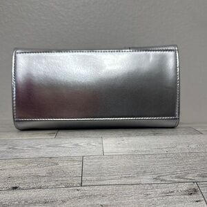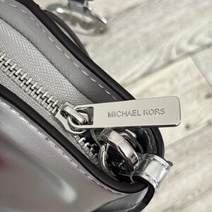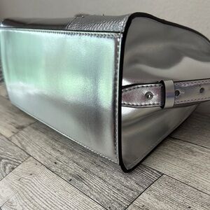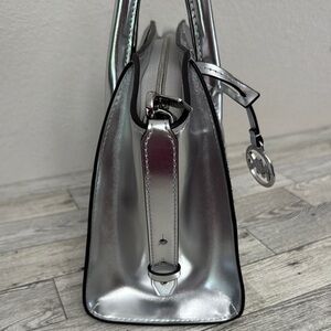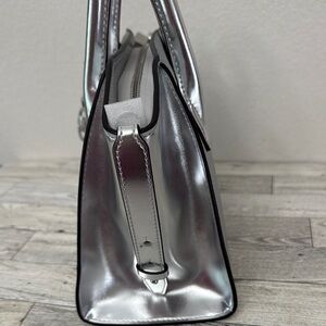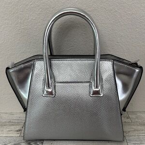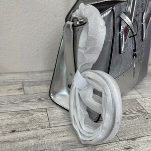 Michael Kors Avril Small Metallic Silver Satchel New With Tag. Boasts a distinctive winged shape and a high-shine finish. Its structured handles and mixed textures, including an embossed geometric pattern, add to its sophisticated appeal. Includes removable crossbody strap. Measures 12” x 8” x 4”