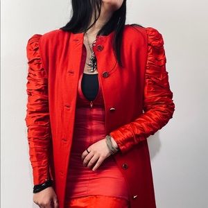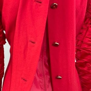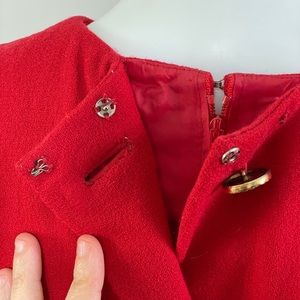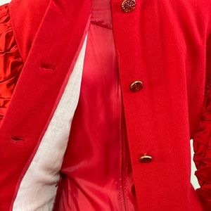 I have no words for this dress. The Ruched Sleeves are so dramatic, but that's not enough! The back has this jeweled buttons from top to bottom of the dress and when you opened them, the inside of the dress, the lining has a zipper, which allows you to wear it backwards as well. I am a size 6-8 at this point. This dress says medium but it is a vintage Bill Blass, most likely 80s. It has built in shoulder pads too. No stretch, no pockets.