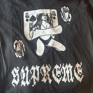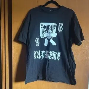 Supreme short-sleeve graphic tee. Features a white playing card queen print and stylized text on front. Casual and bold streetwear look.