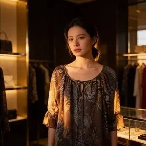 Lightweight sheer peasant blouse in brown with taupe and muted accents. Scoop neckline with short button placket. Flowy body and relaxed short sleeves. Easy to dress up or down.