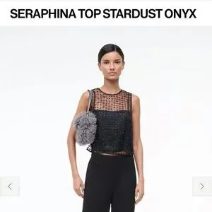 Sheer mesh top with all-over black bead embellishment. Includes a matching black underlayer. Sleeveless cropped silhouette.