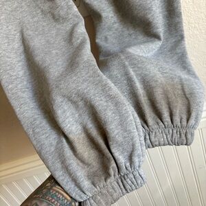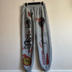Has some pilling and stains on heels of pants. Gray fleece sweatpants with bold graphic prints. Features red, black and yellow artwork across front. Casual, streetwear vibe. Elastic waist and pockets. Bold printed details for standout style.