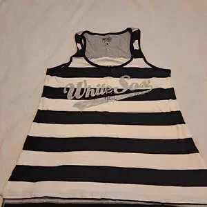 Casual black and white striped racerback tank with White Sox graphic. Soft, breathable fabric for everyday wear. Lightweight design layered easily with jackets or leggings. Classic black and white colorway for versatile styling.