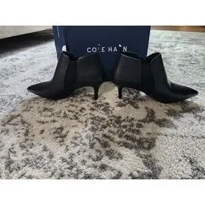 The NEW Cole Haan Neely Shootie Womens Heeled Chelsea Boots in black are a stylish and comfortable choice for any woman in a Size 9. Featuring a pointed toe and ankle shaft style, these boots have a trendy pull-on closure and a stiletto heel. With a mid-height heel for added comfort, these boots are crafted from leather with a textile lining, making them a versatile and fashionable option for any outfit.