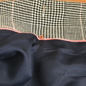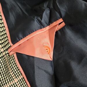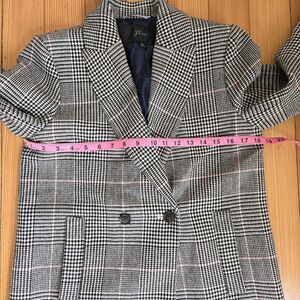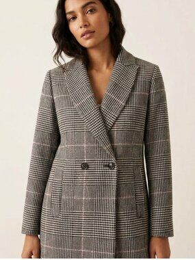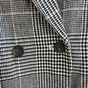 This is the elevated, fully lined version of the iconic J.Crew Daphne silhouette. While the standard Daphne is unlined, this structured topcoat features a smooth 100% polyester lining. A perfect transition wardrobe piece for Spring for Fall months. The fabric is a sophisticated houndstooth glen plaid in black and white, accented with a feminine pink overcheck that adds a modern twist to a classic Dark Academia look. With its double-breasted closure and sharp notched lapels, it perfectly captures the Quiet Luxury aesthetic. The wool blend is soft yet substantial, providing warmth and a polished drape that doesn't loose its shape.