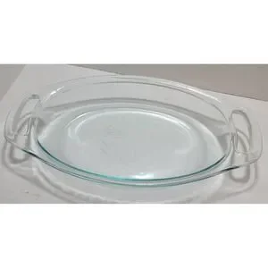 The Pyrex 1.3 Qt Easy Grab 10x7 Oval Clear Dish with Navy Blue Snap-On Lid is a solid, American-themed casserole/baking dish made of glass. This vintage-inspired piece features a glossy finish, pressed glass production style, and is machine washable for easy care. With a capacity of 1.3 Qt and a single compartment, this Pyrex dish is perfect for baking and serving a variety of dishes with its convenient handles and stylish design.