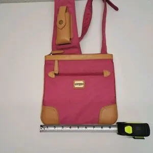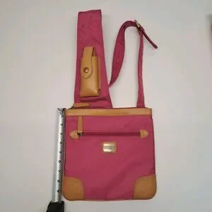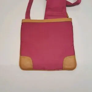 The MAGGI B Cross Body Bag in Pink/Tan is a stylish and practical handbag for women. Made with 100% polyester/ faux leather, this medium-sized rectangular bag features a solid pink exterior with a beige fabric lining. The bag has a zipper closure and includes inner and outer pockets for organization. With an adjustable strap and a drop of 22 inches, this cross body bag is perfect for everyday use and can easily complement various outfits.