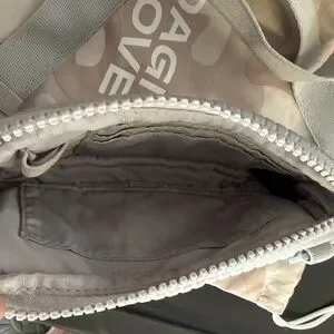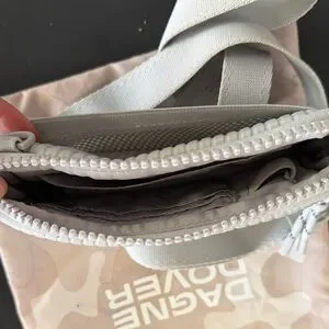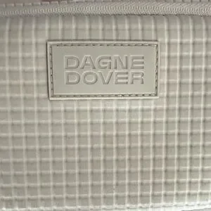 Compact crossbody with quilted texture. Removable adjustable strap for versatile wear. Top zip closure keeps items secure. Subtle embossed logo on front for a clean look.