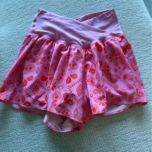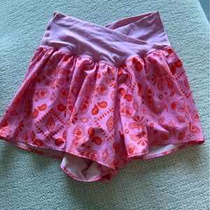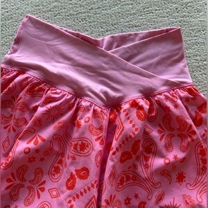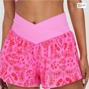 Bright pink shorts with a bold red paisley pattern. Lightweight fabric for easy movement. Elastic waistband for comfort. Casual sporty style for workouts or errands.