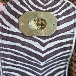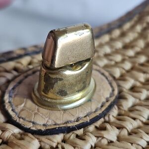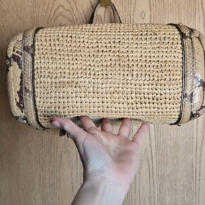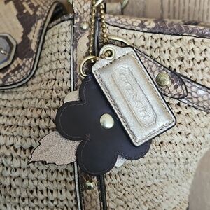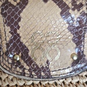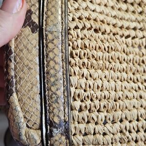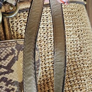 Coach tote crafted in woven natural straw. Snakeskin-print leather trim and straps add contrast. Turn-lock flap and tag detail. Dual shoulder straps for easy carry. Last three pictures show wear. Otherwise she is in great shape.