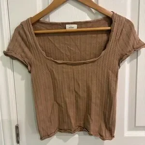This is a square-neck, short-sleeve sweater with scallop-edge details and fully fashioned construction. This version is constructed with a Pointelle stitch for a delicate look and airy feel. Excellent condition, just needs a steam.