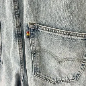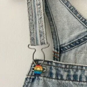 Preowned Levi’s Pride Liberation denim short overalls, size Medium, featuring a bright rainbow patch on the bib. A rare and vibrant piece celebrating inclusivity and style—perfect for collectors, Levi’s enthusiasts, or festival/outfit wear.