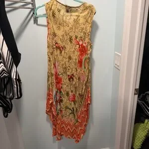 Lightweight sleeveless tunic dress showcases a vibrant mixed print featuring butterflies, large floral blooms, and a geometric chevron border. The tan base is covered in a delicate line-art floral overlay, creating a layered visual effect. Designed with a relaxed, flowy silhouette and a dramatic handkerchief hem, this piece offers a bohemian aesthetic. The breathable cotton-rayon blend fabric ensures comfort for warm-weather wear or layering.