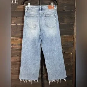 Light wash denim with subtle distressing at the knee. Straight leg silhouette. Casual everyday style. Soft faded blue color.