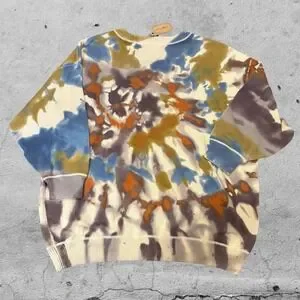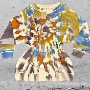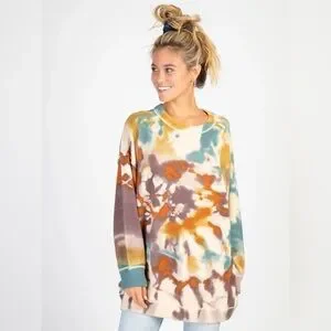 Soft knit tie-dye cowl sweater. Relaxed fit with long sleeves. Vibrant multicolor pattern. Comfortable and casual. Easy to style.
