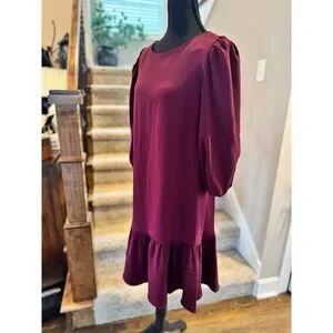 Elegant DKNY plum shift dress with a flattering relaxed silhouette and feminine details. Features soft bubble sleeves and a ruffle hem for a romantic, effortless look. Fully lined and perfect for date nights, events, or holiday wear. Classic, timeless piece that can be dressed up or down.
