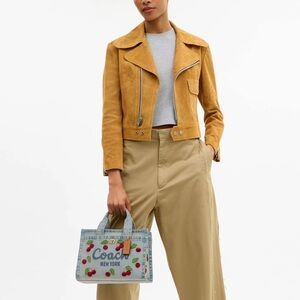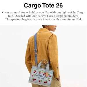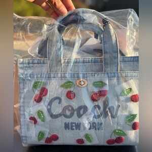 This NWT Coach Cherry Embroidered Denim Cargo Tote 26 is a stylish and practical women's handbag. Featuring a cherry pattern on denim exterior, this tote is both fashionable and versatile. With plenty of space at 26 inches in size, this cargo tote is perfect for carrying your daily essentials. The original packaging adds to the authenticity of this luxury Coach bag, making it a must-have accessory for any fashion-forward person who loves cherries!